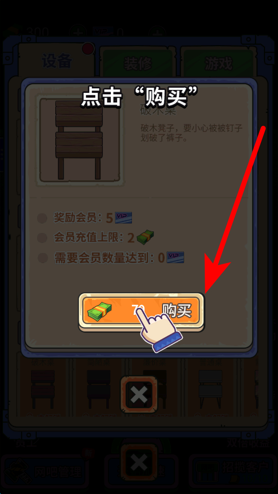 4、在管理界面中,若要购置设备,找到对应的设备选项,当满足条件时,点击“购买”按钮,就能为网吧添加新设备,提升网吧的设施水平,吸引更多顾客。