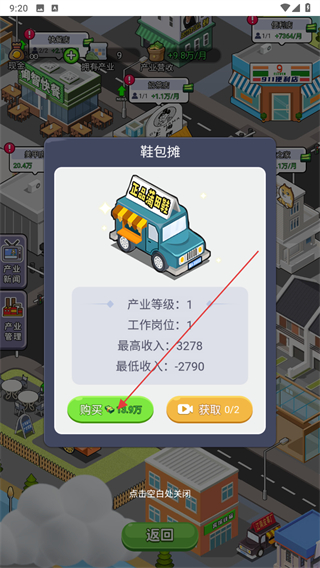 3、点击产业地图里的鞋包摊弹出购买窗口,消耗13.9万资金点击购买按钮获取该产业,其等级为1有月度浮动收入。