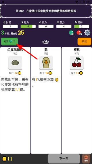 4、根据资源和策略选择刷新或符号选项,选择操作是推进游戏进程的重要操作,选择后可调整角色发展路径,积累财富等属性。