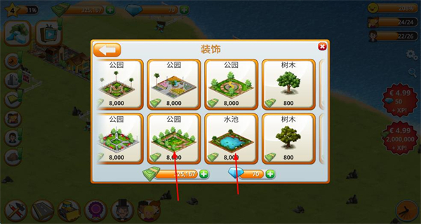 4、在装饰界面,消耗资源购买装饰设施,丰富城市景观,优化城市环境。