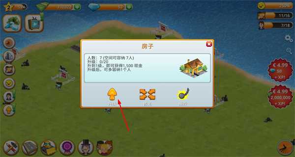 2、点击建筑弹窗内升级按钮,提升建筑等级,增加人口并获取更多资金,助力城市发展。