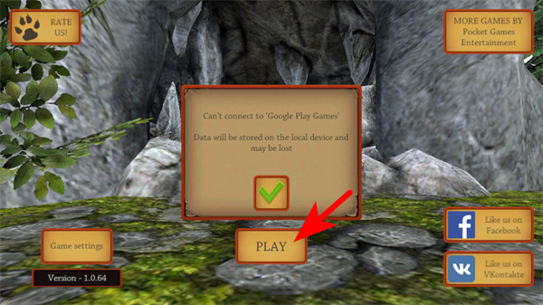 1、进入游戏提示界面后,先点击弹窗里的对勾按钮关闭提示,再点击红色箭头指向的PLAY按钮,开启游戏冒险,这是进入游戏场景的关键操作。