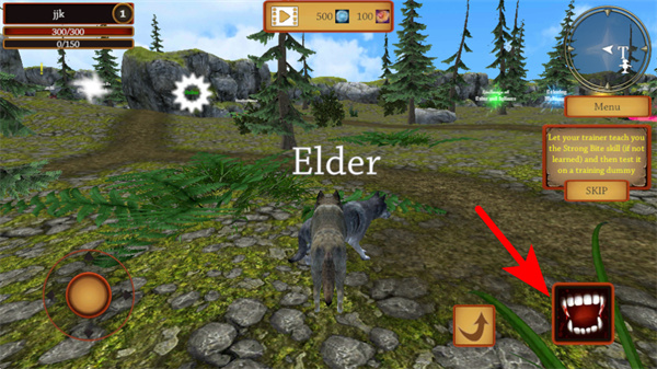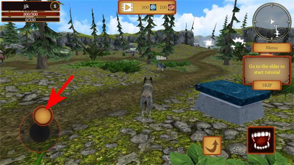 2、进入场景后,操控红色箭头指向的移动按钮,控制狼角色在场景中移动,朝着elder长者的方向前进,注意观察场景中的路径和目标位置。