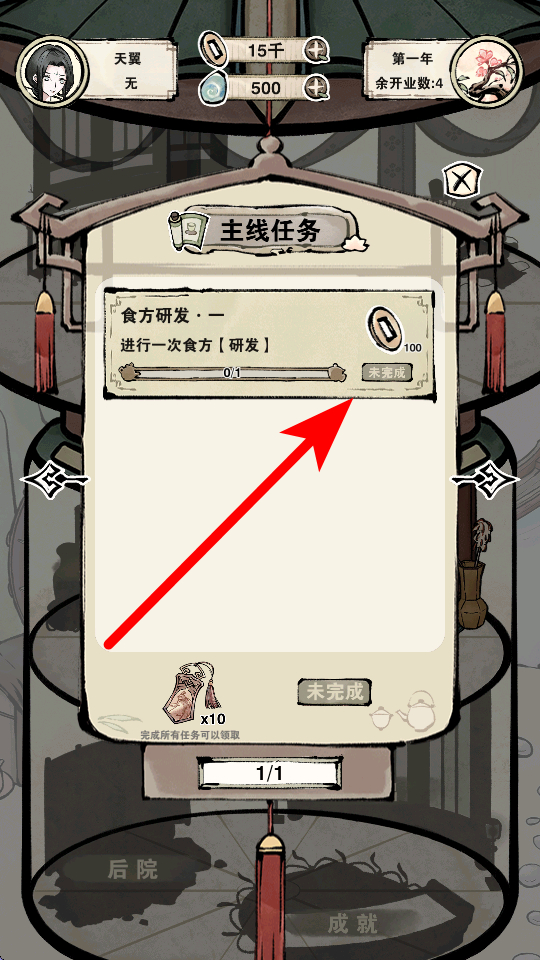 3、主线任务里有食方研发一任务,需要进行一次食方研发,完成该任务可获得奖励,当前显示未完成。