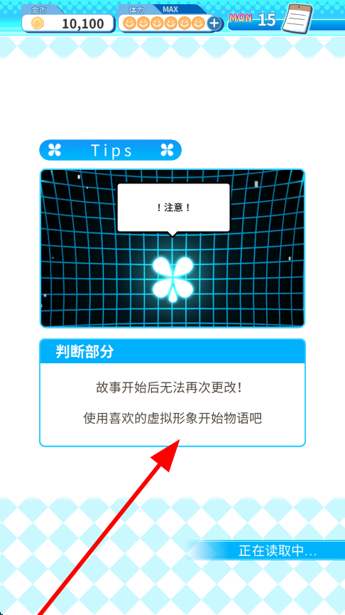 1、开局创建提示,告知故事开始后无法更改虚拟形象,所以要挑选喜欢的虚拟形象,之后开启物语,这是进入剧情的第一步。