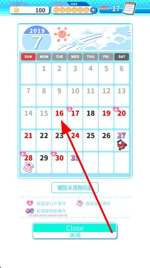 4、查看日历,了解不同日期的事件,像好感度UP事件、服装变更事件等,根据日历安排,更好地参与剧情,感受多样内容。