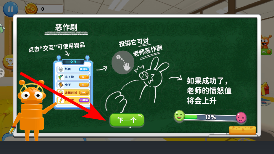 3、规则了解环节,会有关于恶作剧的规则说明,比如点击交互可使用物品,投掷物品能对老师恶作剧,成功的话老师愤怒值会上升,需了解这些规则。