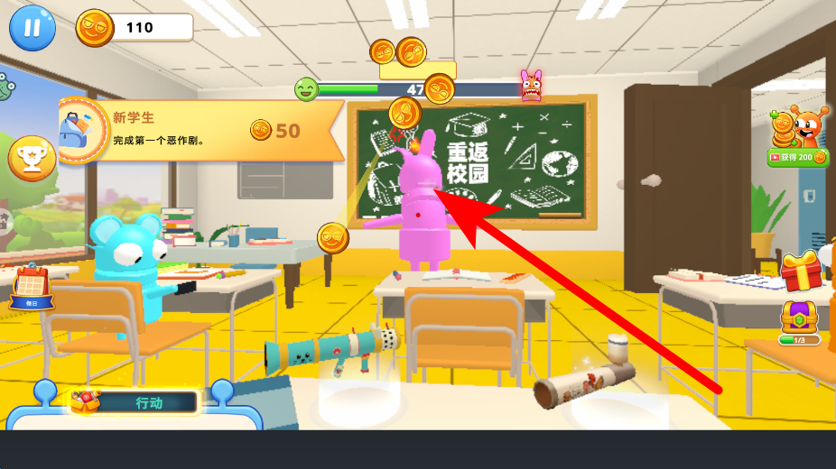 4、砸中老师获取金币奖励,在游玩的场景中,利用可使用的物品,瞄准老师进行投掷,成功砸中老师后,就能获取金币奖励,积累更多游戏资源。