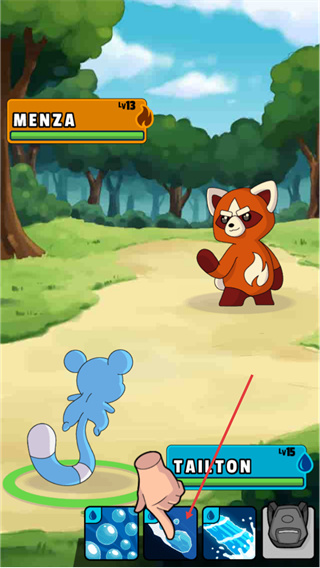 3、进入口袋妖怪对战界面后,观察底部的技能选项,点击对应的技能按钮释放技能,对敌方MENZA发起攻击。