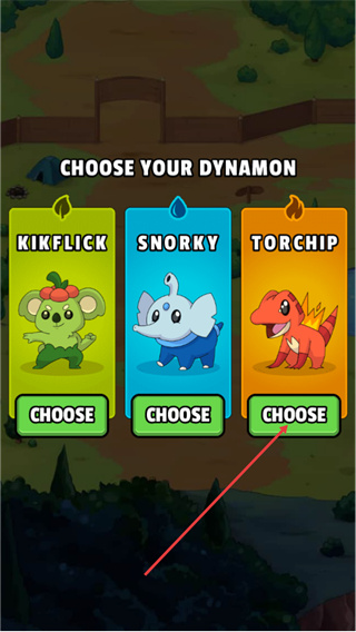 1、这是口袋妖怪的世界界面,有KIKFLICK、SNORKY、TORCHIP三个初始口袋妖怪可选,点击对应角色下方的CHOOSE按钮,即可选定初始伙伴开启游戏。