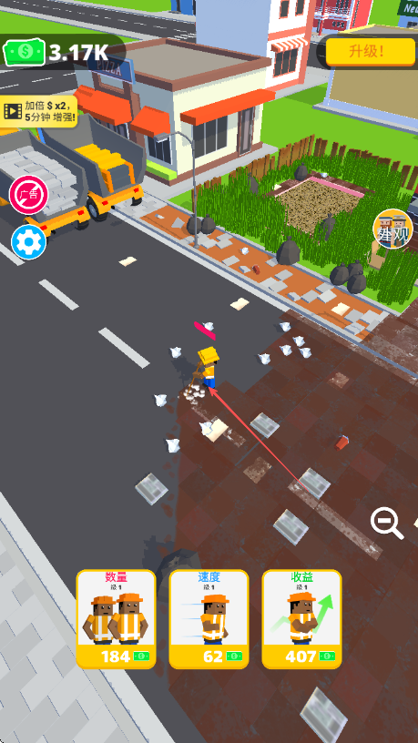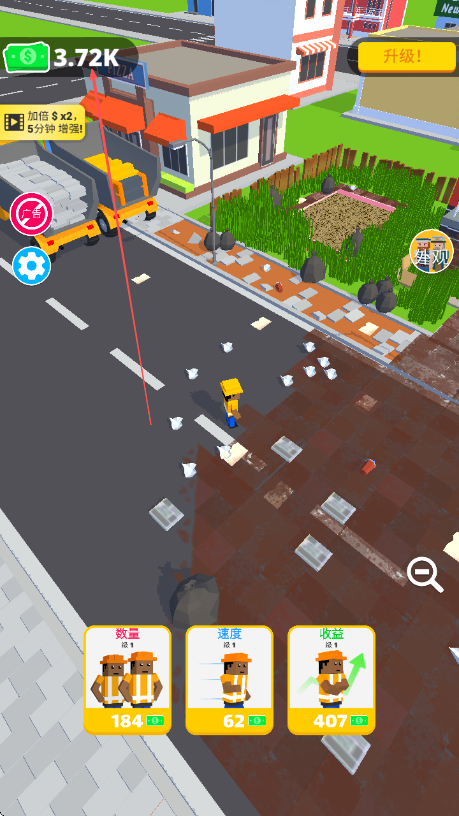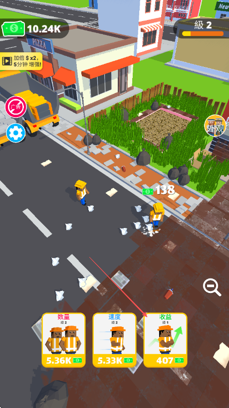 2、操控环卫工人清理路面垃圾,获取金币收益,积累资金。