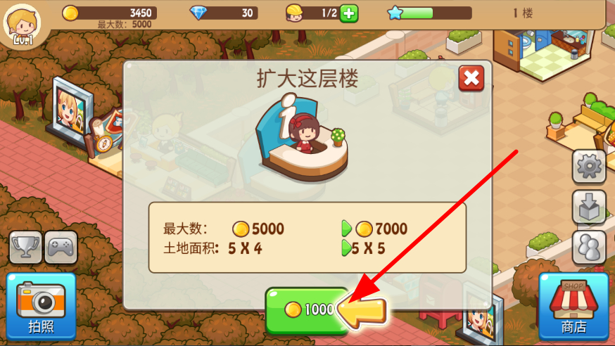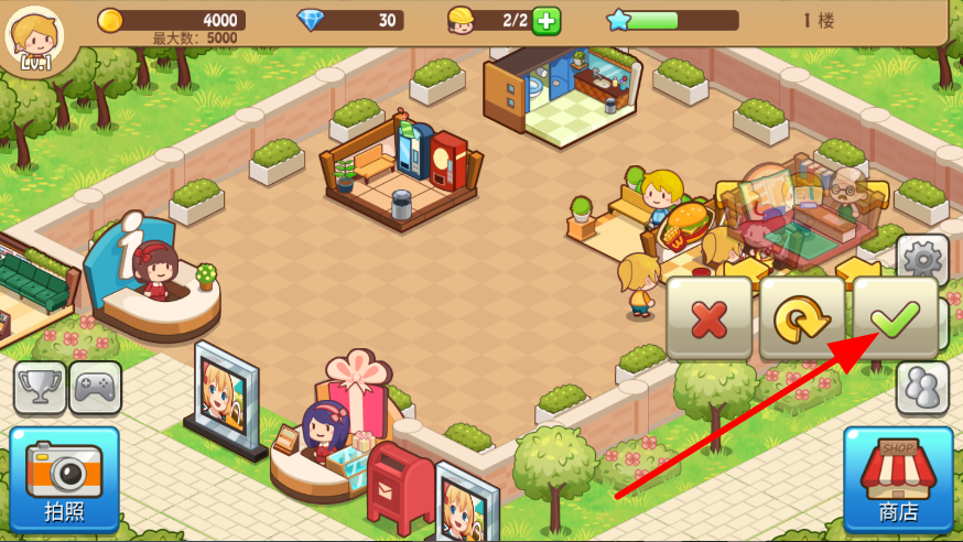 1、进入后对商场内的设施进行布置,根据规划摆放不同的店铺、装饰等,打造出能吸引顾客的商场布局,布置好后进行确认。