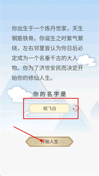 1、在开局界面确认角色名字,点击开始人生,开启修仙生涯。