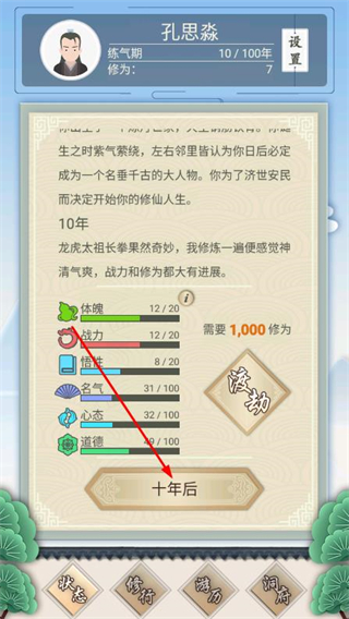 2、在状态界面,点击下方十年后按钮,推进时间以积累修为。