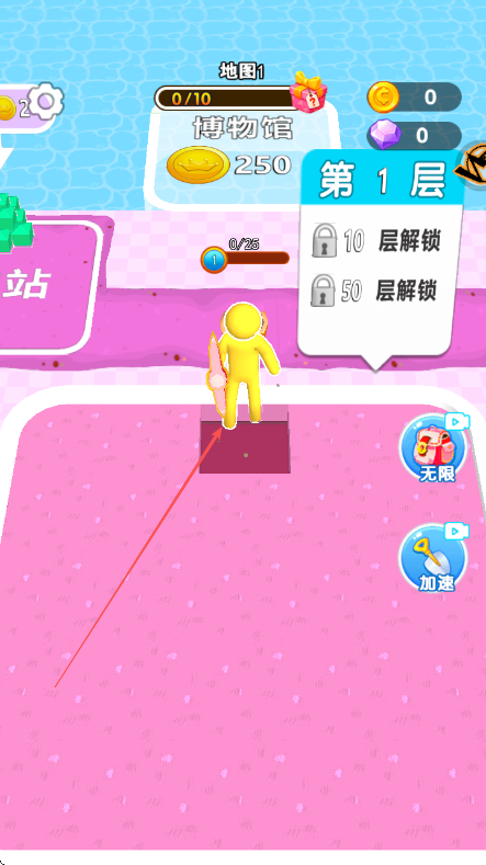 1、进入游戏,查看当前所在地图1,明确博物馆解锁所需金币为250,点击角色进入挖掘区域。