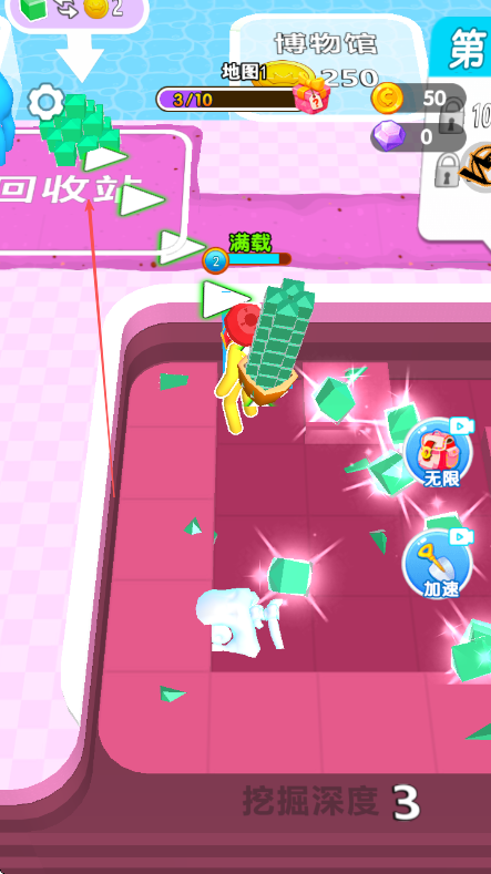 3、当角色提示满载时,按箭头指示将挖掘到的物品运往回收站。