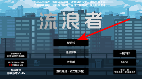 1、进入游戏界面后,点击新游戏开启流浪者的生存冒险,这是进入游戏的关键操作,准确点击可解锁场景交互、资源拾取等玩法环节。