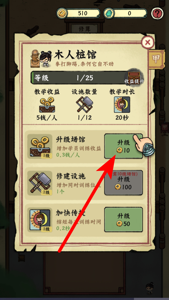2、场馆建成后,可对其进行升级,比如升级木人桩馆,花费少量金币就能增加学员训练收益,提升武馆的赚钱能力。