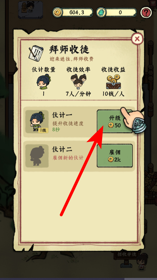 3、在拜师收徒方面,可升级伙计,像升级伙计一,能提升收徒速度,让武馆更快招揽学员,同时也可雇佣新伙计,扩充收徒力量。