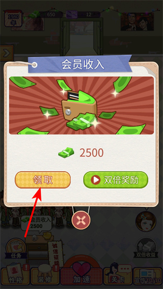1、在游戏中,点击领取按钮获取会员收入,这是积累资金的关键操作,及时领取可用于店铺升级和道具购买。