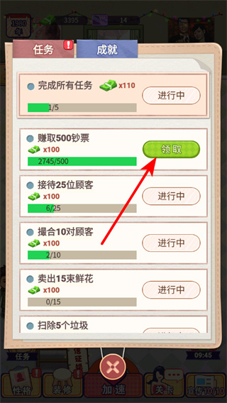 3、在任务界面点击领取按钮获取任务奖励,任务奖励是获取金币和资源的重要途径,完成领取奖励可助力店铺发展。