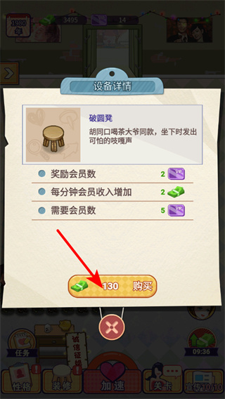 4、购买设备破脚凳,设备购买可提升会员数和每分钟会员收入,是强化店铺经营能力的关键操作,能持续增加收益。