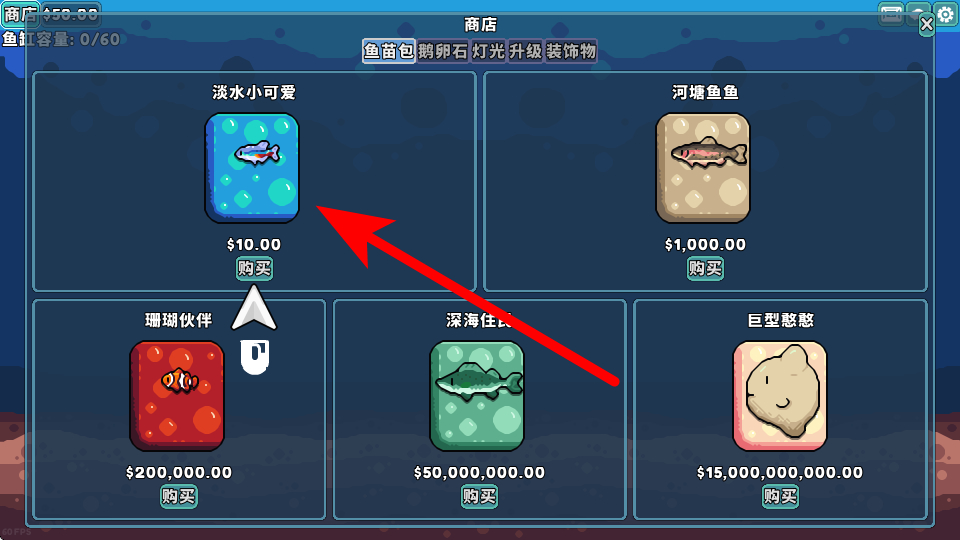 1、进入商店界面,能看到多种鱼苗,像淡水小可爱等,根据自身情况,点击鱼苗下方的购买按钮,即可购入鱼苗,为后续养殖做准备。