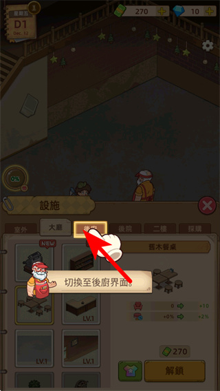 4、在设施界面点击后厨选项,这是切换场景区域的重要操作,切换至后厨界面后可开展后厨相关的布置与功能解锁,完善整体结构。