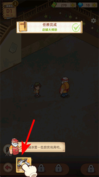 3、在任务完成界面点击对应的道具选项,这是获取店铺用具的核心操作,获取道具后可解锁店铺装饰相关的内容,为布置做准备。