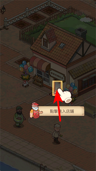 2、点击店铺入口区域,这是进入店铺场景的基础操作,进入后可开展店铺内的布置与经营相关内容,推进游戏的主线流程。