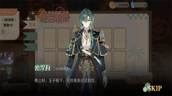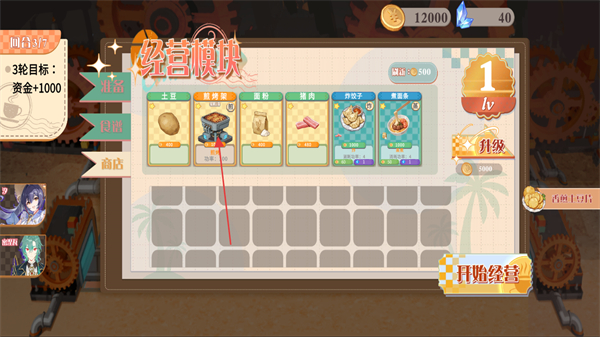 2、进入经营模块界面后,在商店选择购买并配置煎烤架等经营设施,准备完成后点击开始经营推进回合。