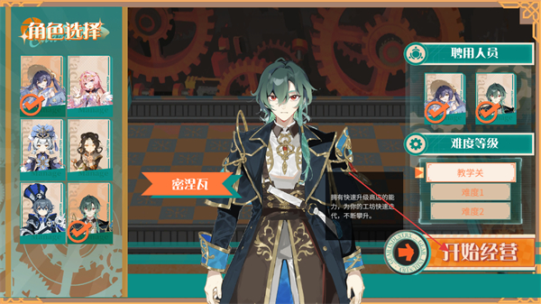 1、在角色选择界面选定角色后,确认雇佣人员与难度等级设置,点击开始经营即可开启游戏流程。