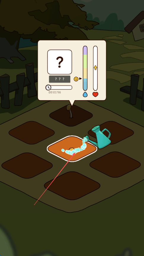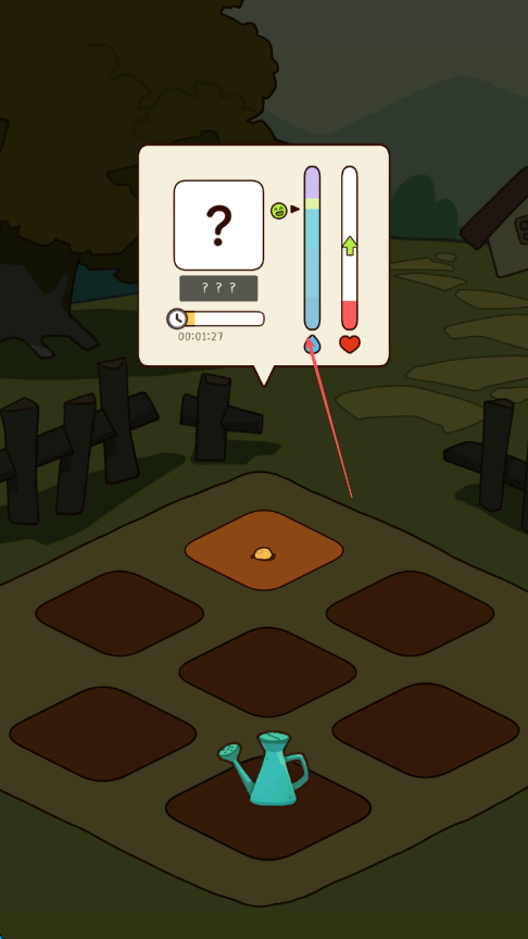 2、出现浇水提示时,点击水壶图标给种子浇水,注意观察右侧类似状态条的数值变化。