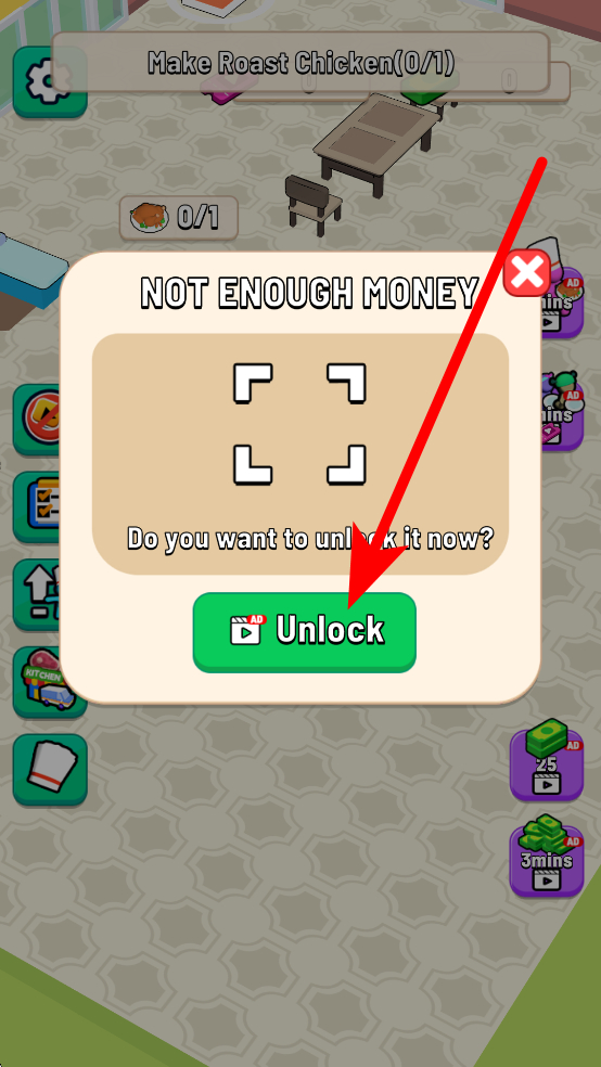 4、当遇到需要解锁新内容但资金不足的情况时,可根据提示,通过观看相关内容的方式,尝试解锁新的功能或区域,助力餐厅更好地经营。