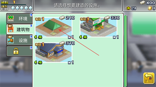 4、建造页面中可以选择环境、建筑物和设施几种不同的选项,搭建的每个建筑都要消耗金钱。