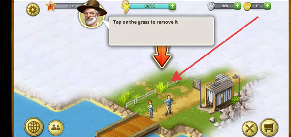 2、根据指引点击草地上的杂草区域,清除杂草以开拓农场可利用的土地。