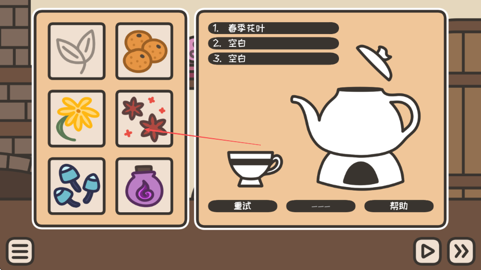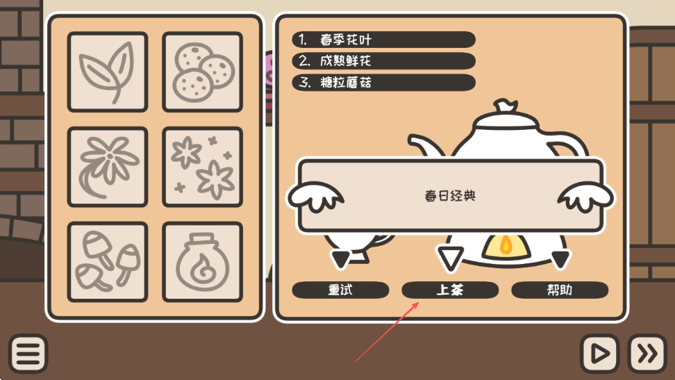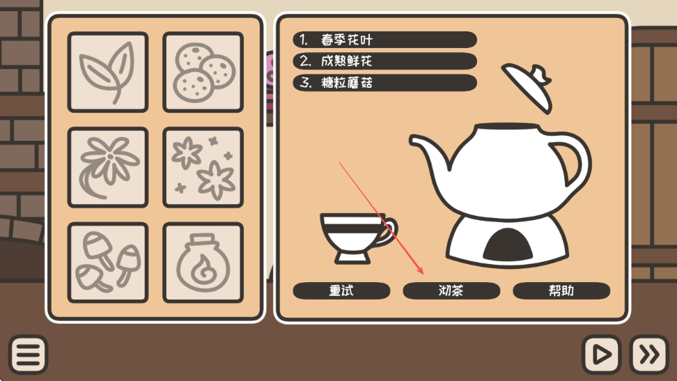 1、游戏开始,查看左侧的食材栏,选择符合要求的食材,按顺序放入右侧茶壶对应的材料栏中。