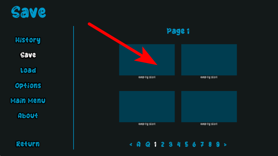 3、紧跟红色箭头指引,在菜单界面选择空存档位保存进度,避免剧情进程丢失,确保后续可继续游玩。