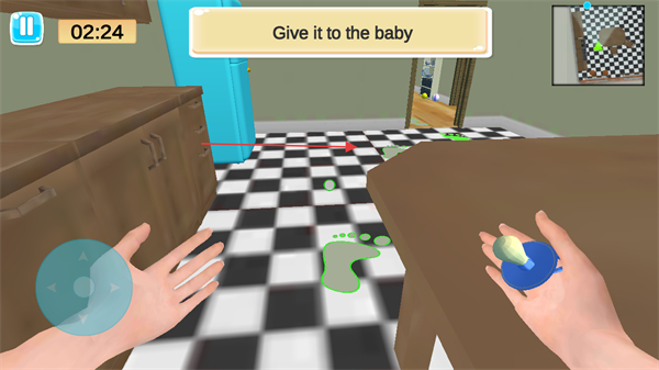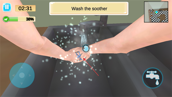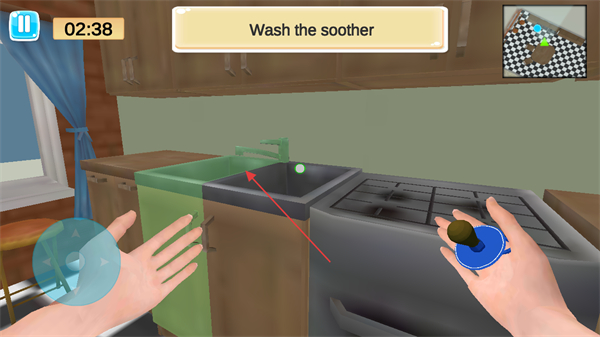 1、看到屏幕上方提示Wash the soother,通过左边虚拟摇杆移动角色到水槽边准备清洗安抚奶嘴。