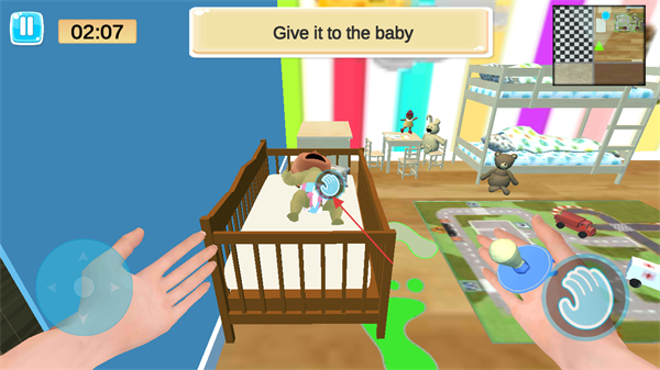 4、到达宝宝床边,点击右下角手掌图标,将清洗好的安抚奶嘴递给宝宝完成任务。