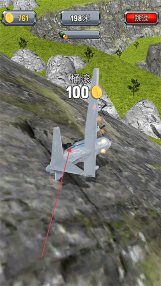 3、触发桶滚动作,获得100金币奖励,持续滑行至198米。