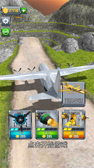 1、操控飞机在山间道路滑行,保持飞行轨迹稳定,开始推进距离积累金币。