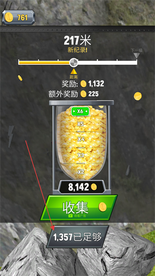 4、滑行至217米达成新纪录,点击收集获取奖励,包含1132奖励及额外奖励。