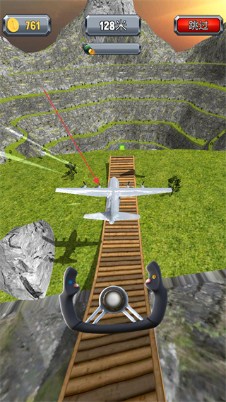 2、通过操控手柄调整飞机方向,在木桥路段前进,累计滑行至128米,获取金币。