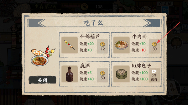 2、消耗金钱换取食物,不同食物的回复的饱腹感和健康度也有所不同。