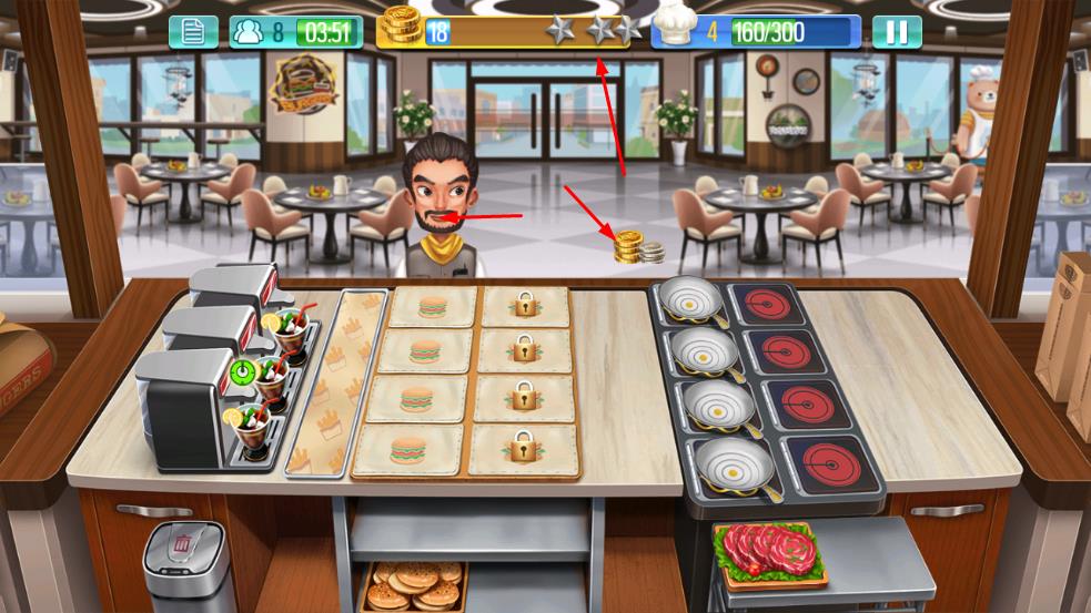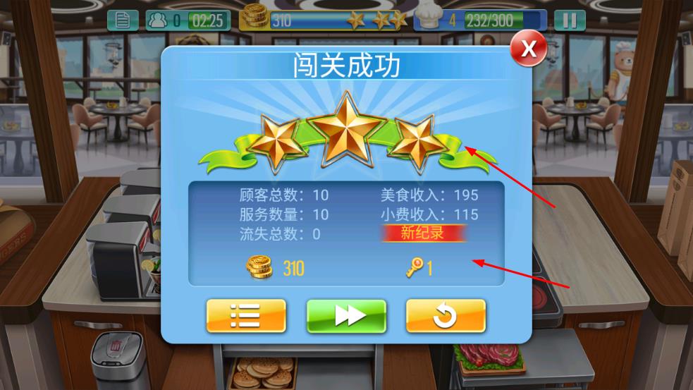 3、完成关卡后,可获得三星评价、金币、钥匙等奖励,刷新小费收入新纪录,为后续关卡解锁奠定基础。