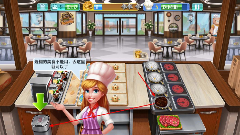 4、若出现烧糊的美食如煎制过度的肉类,需将其丢弃至垃圾桶,保证餐品质量,维持餐厅正常运营。