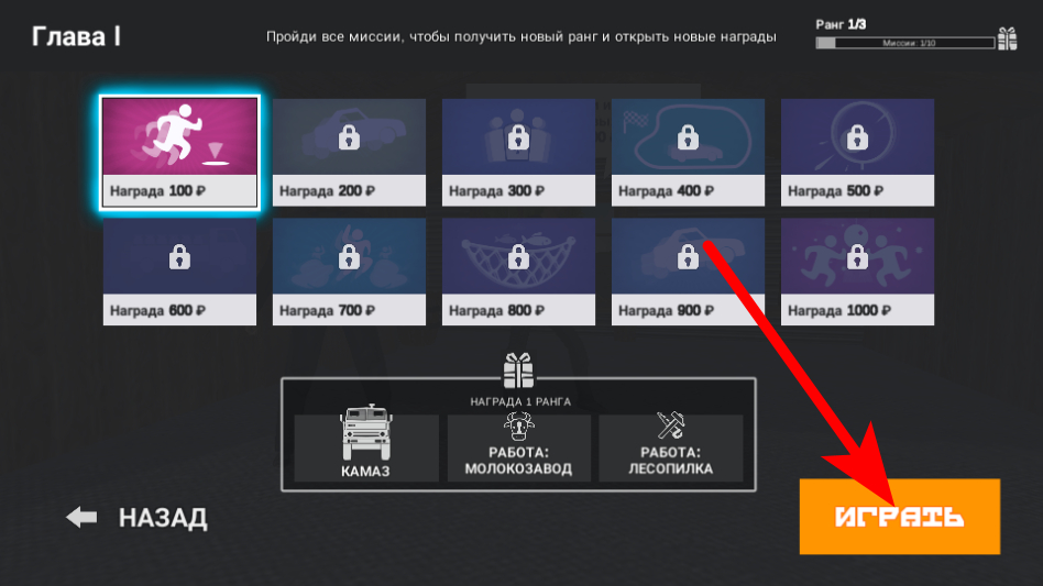 2、在任务界面选择对应关卡如ГлаваI下的任务,点击橙“ИГРАТЬ按钮,开始当前任务。
