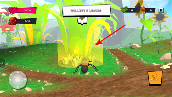 1、进入游戏后,操作箭头指引的摇杆,这是控制角色移动的关键操作,拖动后可让蚂蚁向目标方向行进。