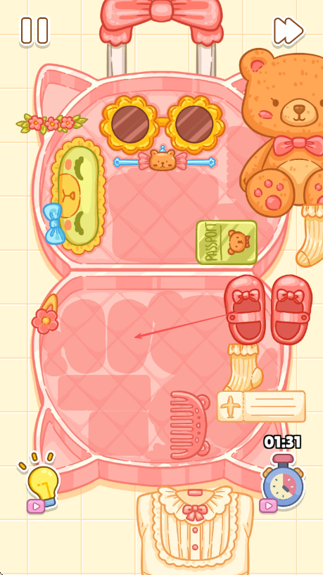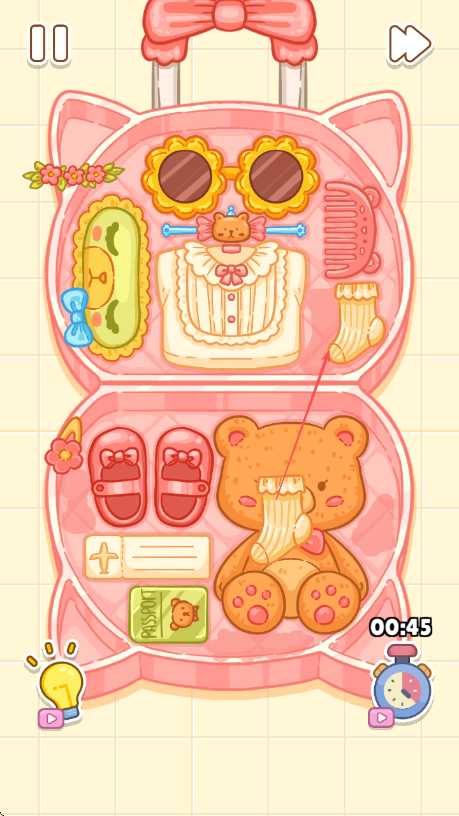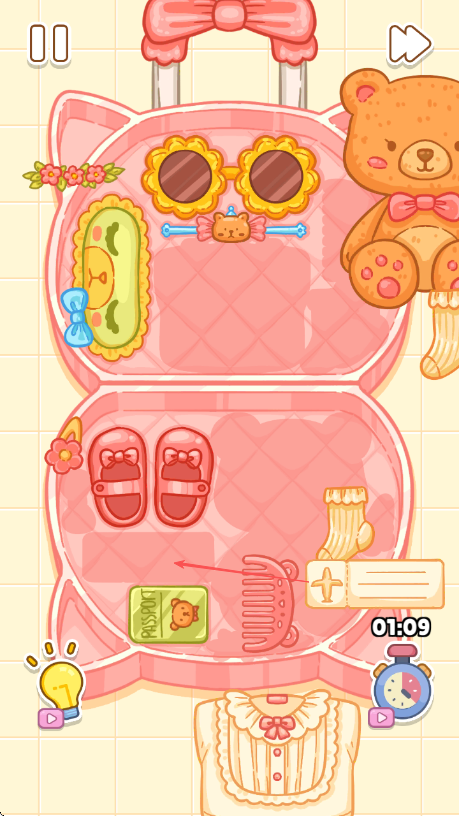 2、治愈系视觉设计:采用甜美柔和的色彩搭配,物件造型圆润可爱,整理过程中伴有物件归位的柔和特效,视觉上营造轻松舒适的氛围,增强解压效果。